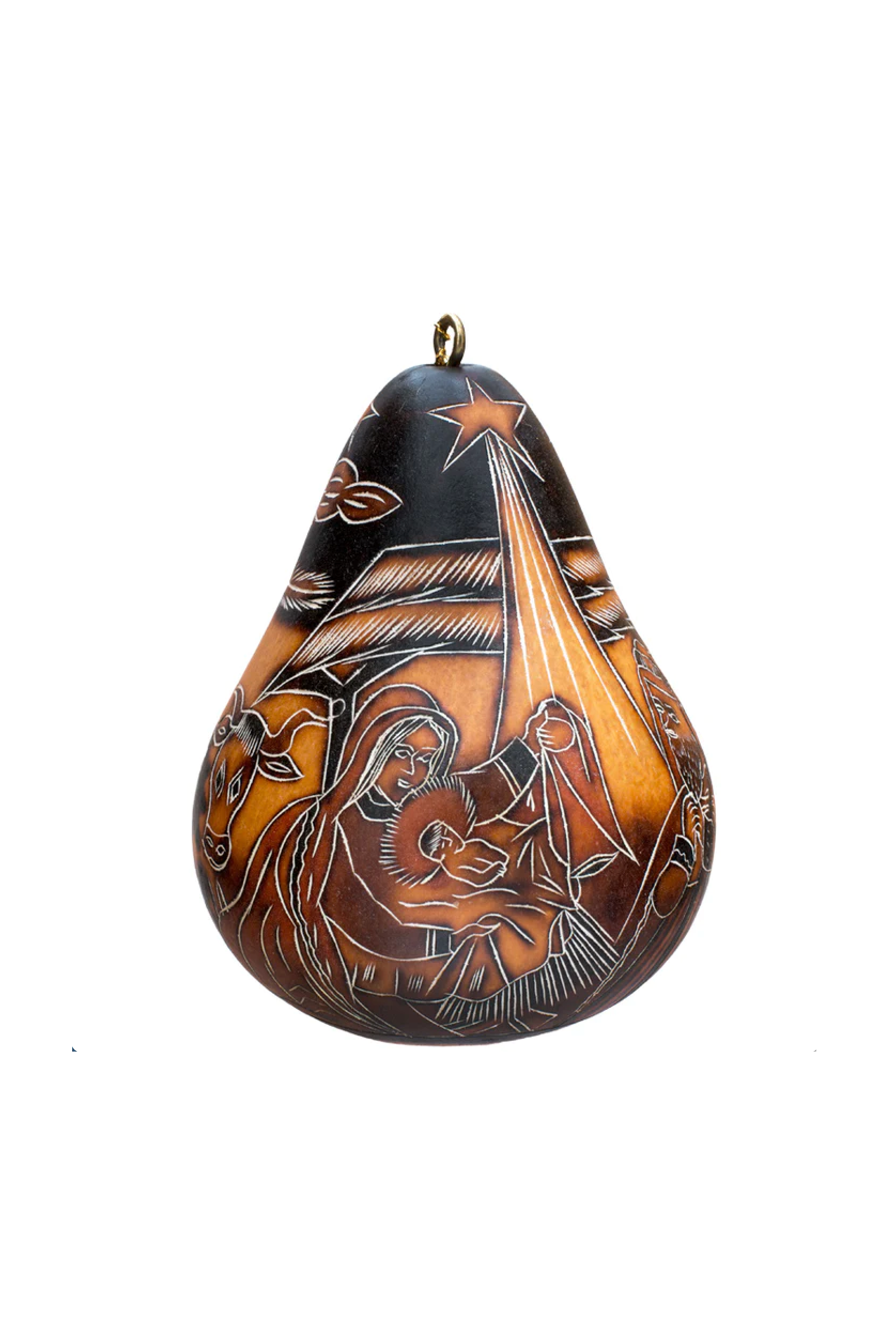 These impressive ornaments are made from gourds which are carefully dried and then decorated with a nativity scene by traditional artisans in Peru. They are a beautiful blend of nature and tradition, and will be a meaningful addition to any Christmas tree. Gourds measure approximately 4 inches, though each is slightly different in natural size and design.
